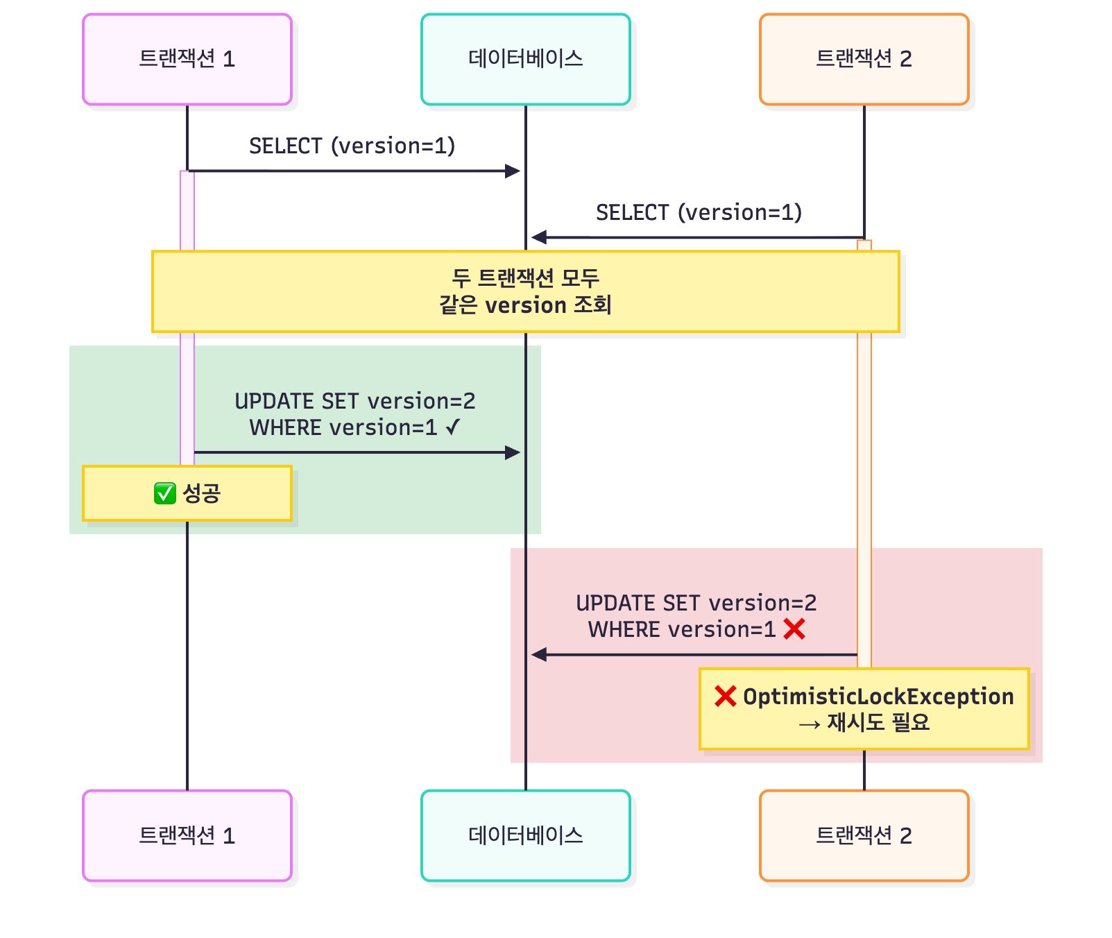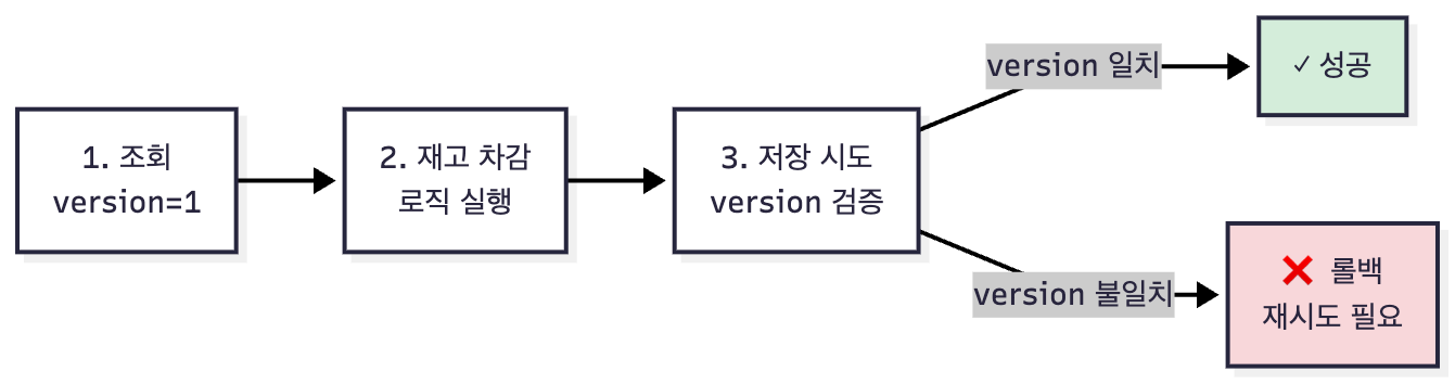 version이 일치할 때만 업데이트- 다른 트랜잭션이 먼저 커밋하면 WHERE 불일치 →