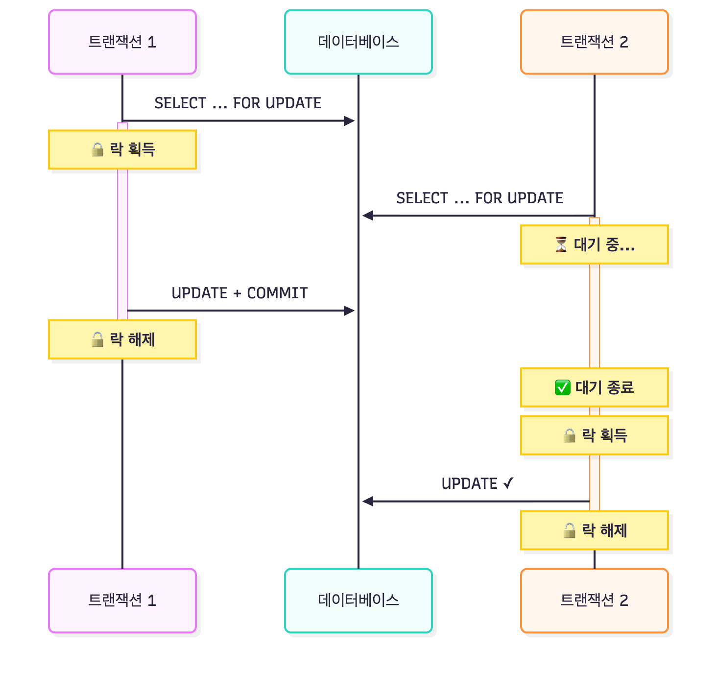 두 트랜잭션이 동시에 같은 데이터를 요청할 때, 먼저 락을 잡은 쪽이 작업하고 나머지는 대기한다.